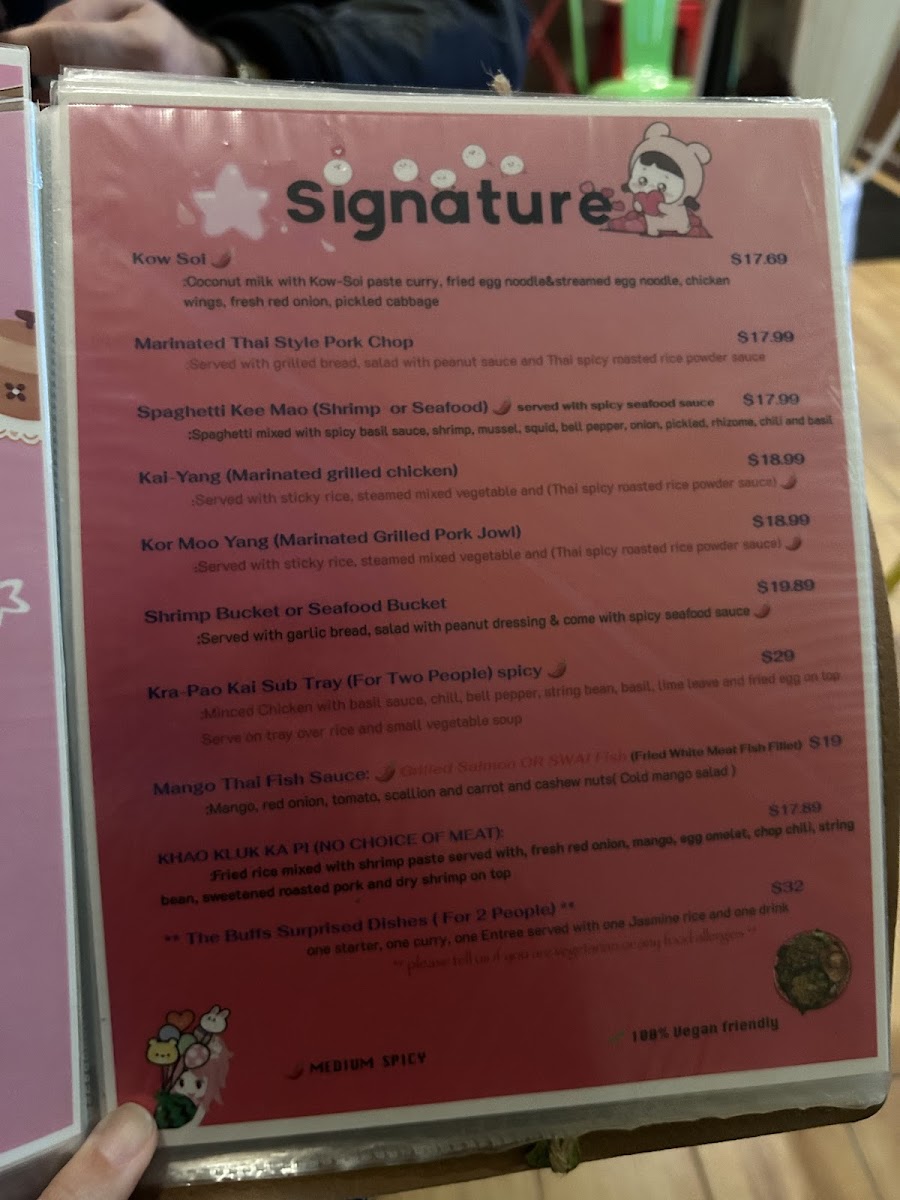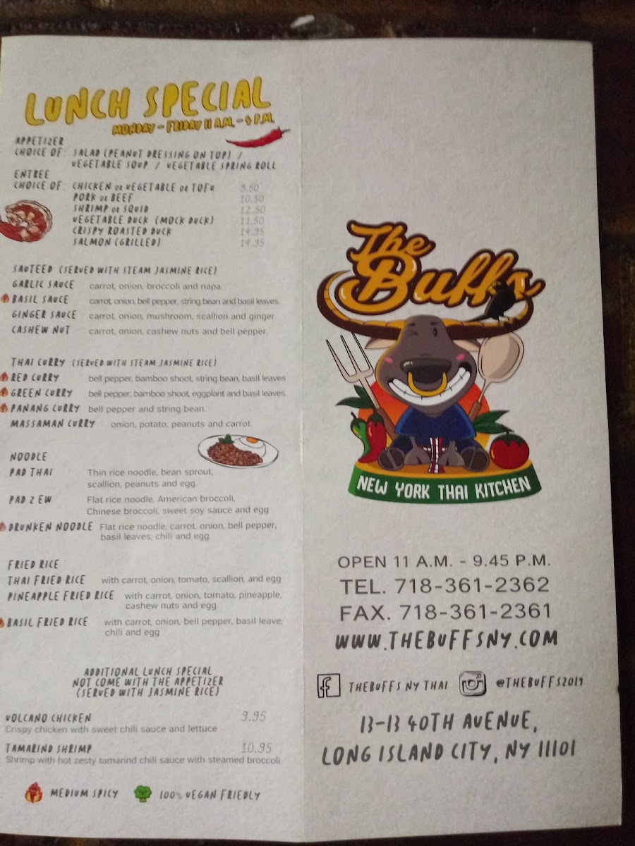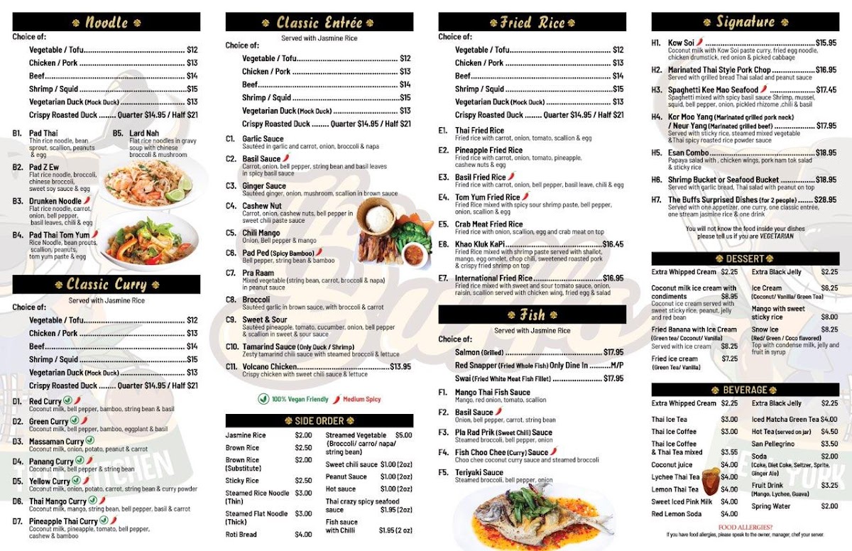 From a reviewer’s perspective, the menu at The Buffs, located at 13-13 40th Ave, Astoria, NY 11101, feels like a well-curated summary of Thai comfort food with enough variety to satisfy both newcomers and seasoned fans of the cuisine. The fried rice selection alone is impressive, ranging from the familiar Thai Fried Rice and Tom Yum Fried Rice to more distinctive options like Crab Meat Fried Rice, Khao Kluk Kapi, and International Fried Rice, each highlighting different layers of aroma and seasoning. Curries are another strong point, with classics such as Red Curry, Green Curry, and Yellow Curry, balanced by fruit-forward twists like Pineapple Thai Curry and Thai Mango Curry. For noodle lovers, staples like Pad Thai, Pad Z Ew, Drunken Noodle, and Lard Nah sit comfortably alongside bolder bowls of Tom Yum Noodle Soup, Duck Noodle Soup, Beef Noodle Soup, Tom Kha Noodle (Coconut White Soup), and Asian Delight Laksa. The menu also shines through its appetizers and salads, where Calamari In The Garden, Thai Herbed Wing, Crispy Rice On Stick, Duck Salad, Chicken Larb Salad, and Nam Tok Salad add texture and freshness to the overall experience. Signature dishes such as Kow Soi, Kor Moo Yang (Marinated Grilled Pork Neck), Neur Yang (Marinated Grilled Beef), Esan Combo, Shrimp Bucket Or Seafood Bucket, and The Buffs Surprised Dishes give the restaurant a clear identity, while fish entrées like Pla Rad Prik (Sweet Chili) Sauce, Fish Choo Chee (Curry) Sauce, Mango Thai Fish Sauce, Basil Sauce, and Teriyaki Sauce round out the savory offerings. Even desserts and beverages feel thoughtfully chosen, from Mango With Sweet Sticky Rice, Coconut Thai Pudding (Ka-Nom-Toy), and Fried Banana to refreshing drinks like Thai Ice Tea, Thai Ice Coffee, and Mango Thai Tea. Overall, the menu reads as a confident and satisfying conclusion to a diverse Thai dining journey-one that emphasizes balance, tradition, and comforting flavors in every category.