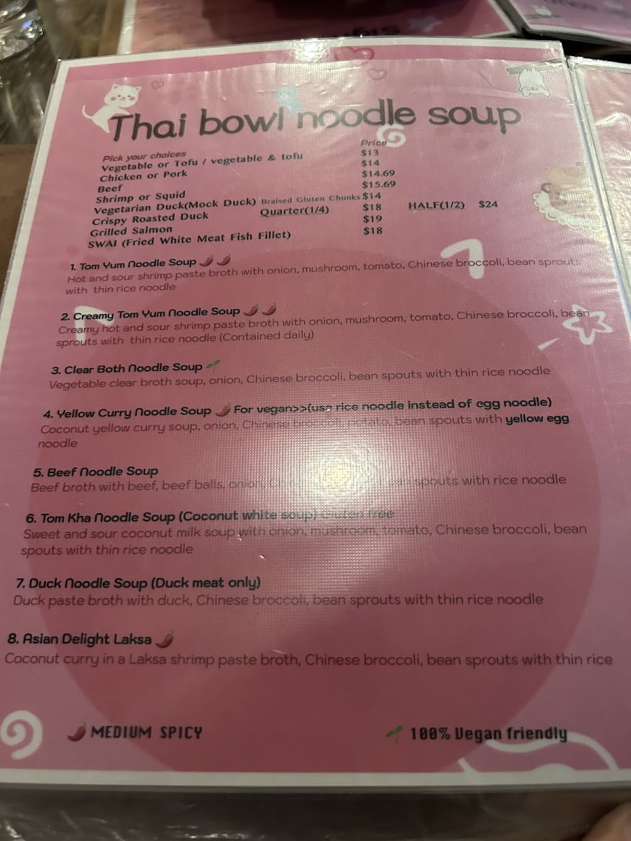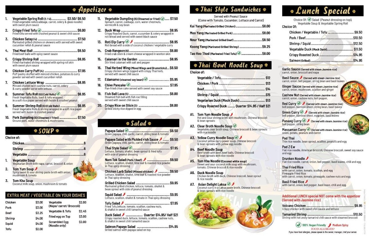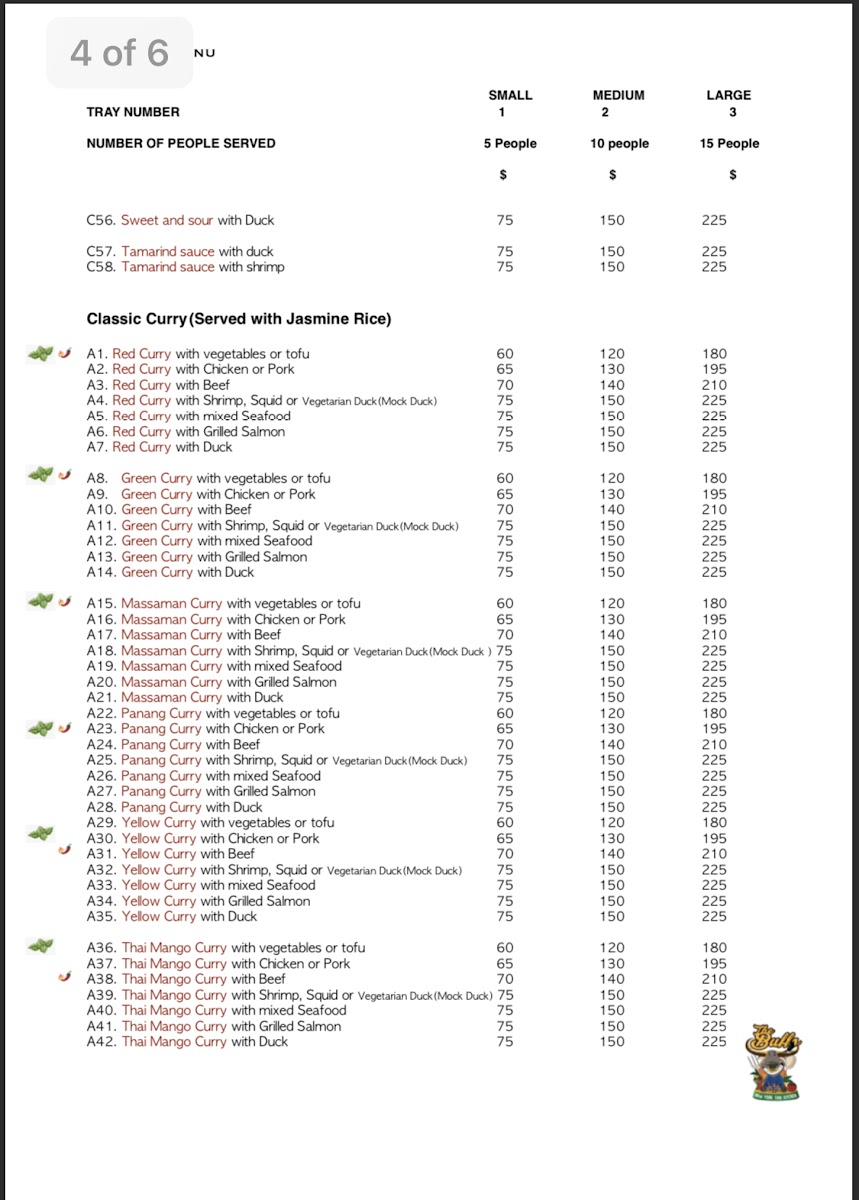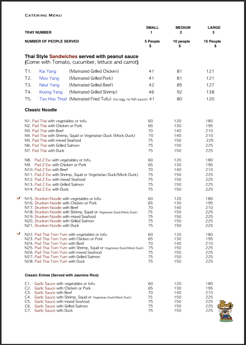 From a reviewer’s perspective, the menu at The Buffs, located at 13-13 40th Ave, Astoria, NY 11101, feels like a well-curated summary of Thai comfort food with enough variety to satisfy both newcomers and seasoned fans of the cuisine. The fried rice selection alone is impressive, ranging from the familiar Thai Fried Rice and Tom Yum Fried Rice to more distinctive options like Crab Meat Fried Rice, Khao Kluk Kapi, and International Fried Rice, each highlighting different layers of aroma and seasoning. Curries are another strong point, with classics such as Red Curry, Green Curry, and Yellow Curry, balanced by fruit-forward twists like Pineapple Thai Curry and Thai Mango Curry. For noodle lovers, staples like Pad Thai, Pad Z Ew, Drunken Noodle, and Lard Nah sit comfortably alongside bolder bowls of Tom Yum Noodle Soup, Duck Noodle Soup, Beef Noodle Soup, Tom Kha Noodle (Coconut White Soup), and Asian Delight Laksa. The menu also shines through its appetizers and salads, where Calamari In The Garden, Thai Herbed Wing, Crispy Rice On Stick, Duck Salad, Chicken Larb Salad, and Nam Tok Salad add texture and freshness to the overall experience. Signature dishes such as Kow Soi, Kor Moo Yang (Marinated Grilled Pork Neck), Neur Yang (Marinated Grilled Beef), Esan Combo, Shrimp Bucket Or Seafood Bucket, and The Buffs Surprised Dishes give the restaurant a clear identity, while fish entrées like Pla Rad Prik (Sweet Chili) Sauce, Fish Choo Chee (Curry) Sauce, Mango Thai Fish Sauce, Basil Sauce, and Teriyaki Sauce round out the savory offerings. Even desserts and beverages feel thoughtfully chosen, from Mango With Sweet Sticky Rice, Coconut Thai Pudding (Ka-Nom-Toy), and Fried Banana to refreshing drinks like Thai Ice Tea, Thai Ice Coffee, and Mango Thai Tea. Overall, the menu reads as a confident and satisfying conclusion to a diverse Thai dining journey-one that emphasizes balance, tradition, and comforting flavors in every category.
